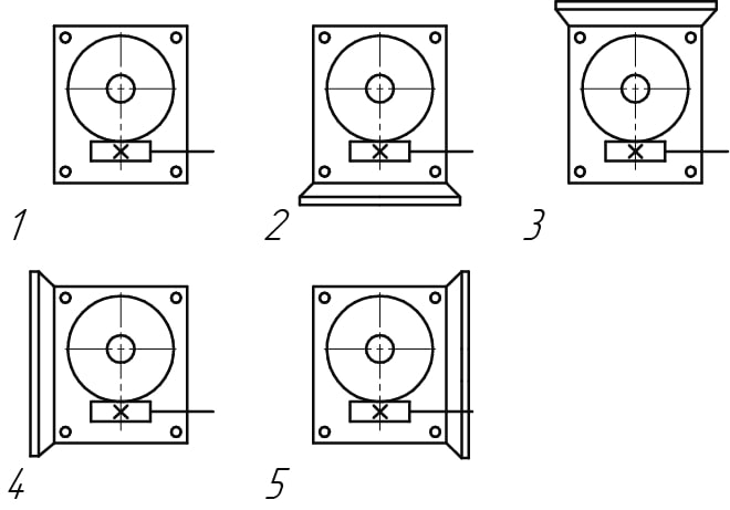 51 — вариант сборки (выходной вал снизу, вход сзади — вертикальное исполнение);
